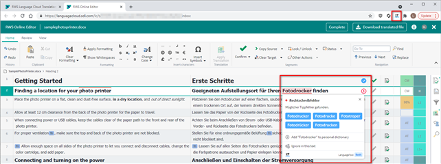 Note: This tool is not officially supported, it is just one example that we tested among the tools that can work in text fields in browsers in this way. There may be other tools with similar functionality. At this point in time, this add-on works best in segments without tags and other non-textual elements. We will look at improving the integration with this and other add-ons where possible.