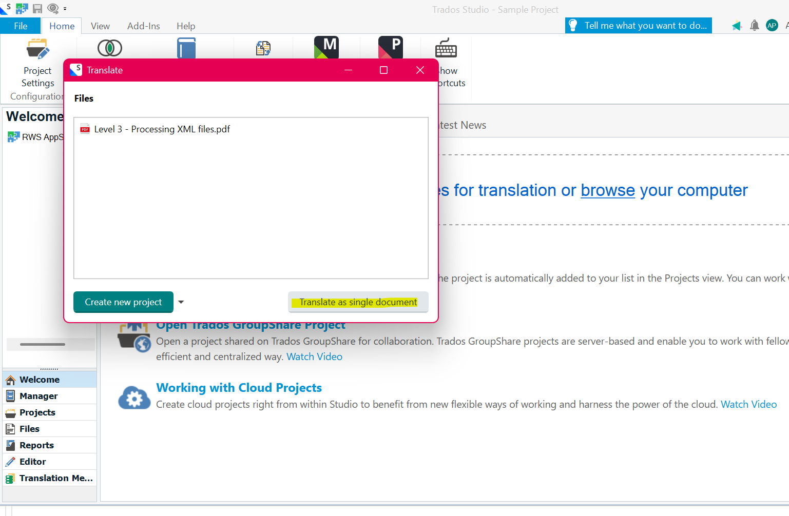 If you would like the ability to translate in the cloud (Trados clous capabilities) and in Trados Studio- select Create Cloud Project.