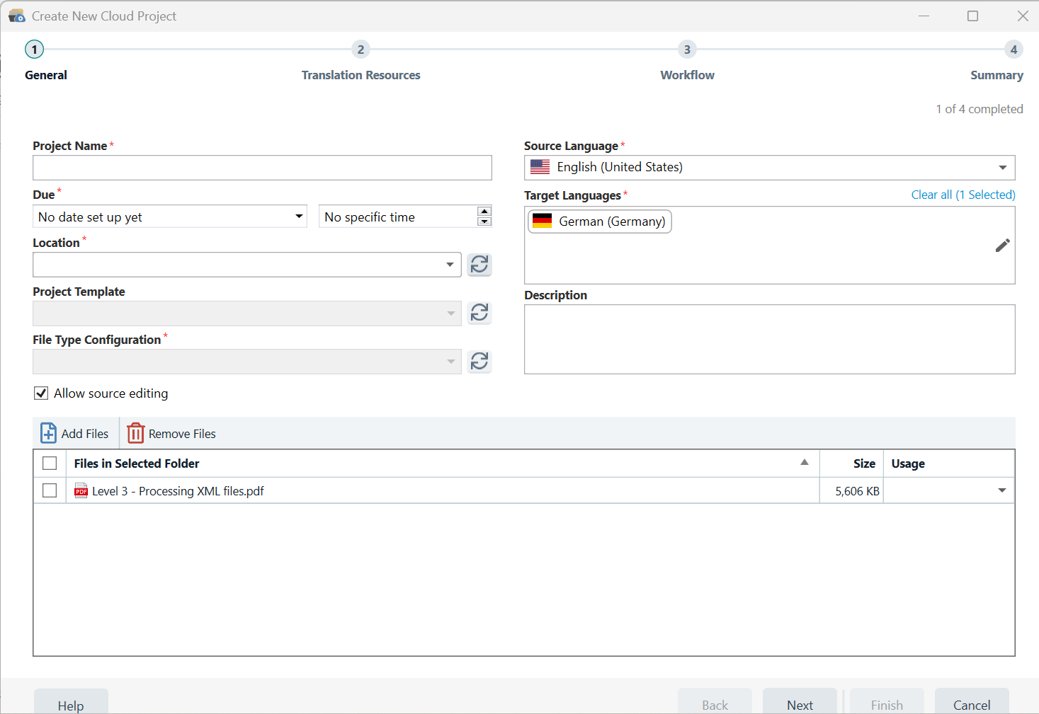 Note: 'Translation resources', 'Termbases' and 'Language pair' is already enabled, as these were set, when creating the original Resource and Settings template.