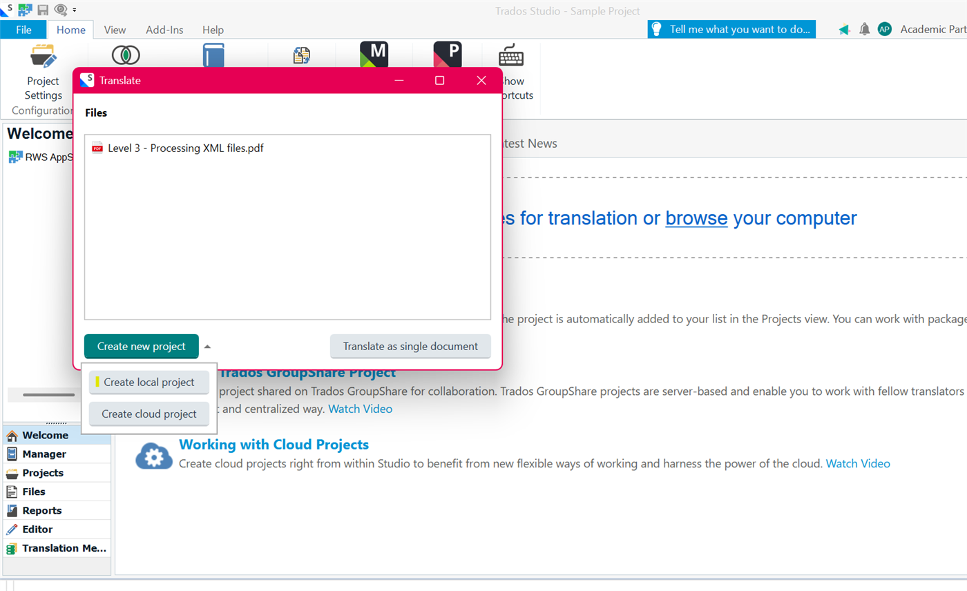If you create a 'Translate single document' or 'New Local project', you can only translate these in Trados Studio and cannot (yet) upload these to the cloud.