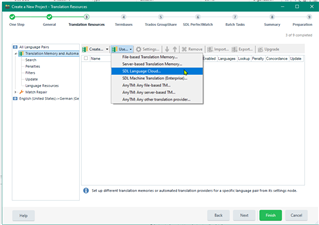 Select required Translation Memories (local) and Machine Translation provider(s) as required