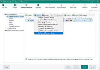 Select required Translation Memories (local/server) and Machine Translation provider(s)*