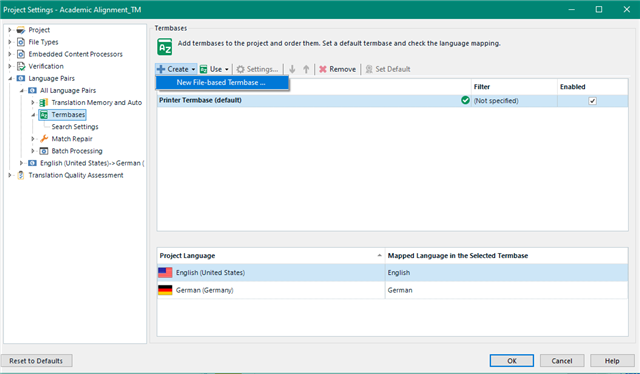 First go to your project settings, select Termbases and Create- New File-based Termbase