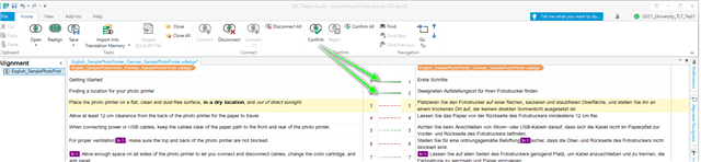 To confirm the TU's (Translation Units) click in both the source and target TU's (active TU's will turn yellow) and Confirm