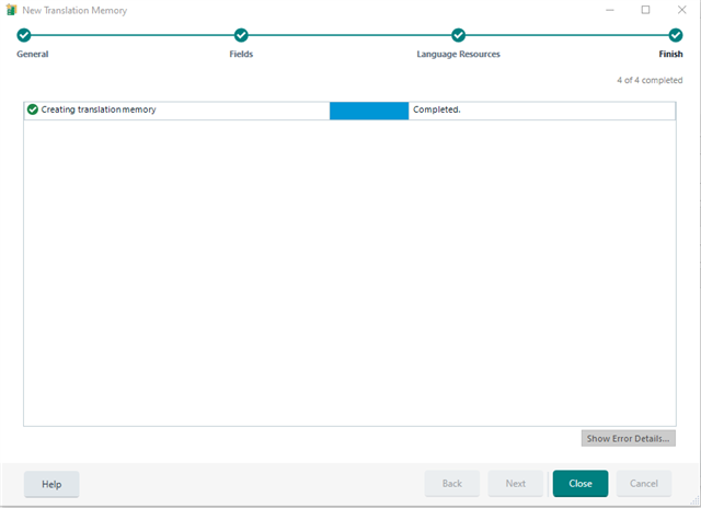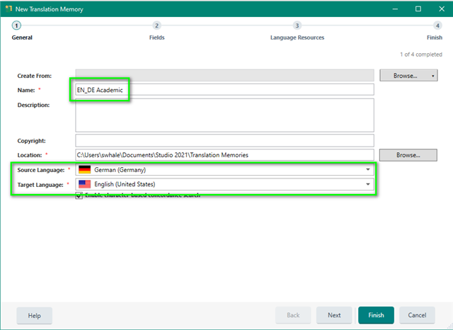 If you click NEXT, you can define the Fields and Language Resources- or click Finish to create the TM with the default settings.