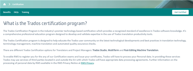 On passing the certification exams, you are awarded 'Trados Certified' status, thereby proving CAT tool competency in the world's leading CAT tool.