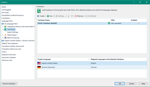 The basic settings will include Languages, translation memories and termbases.
