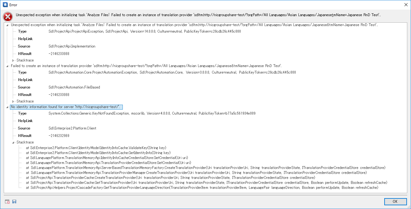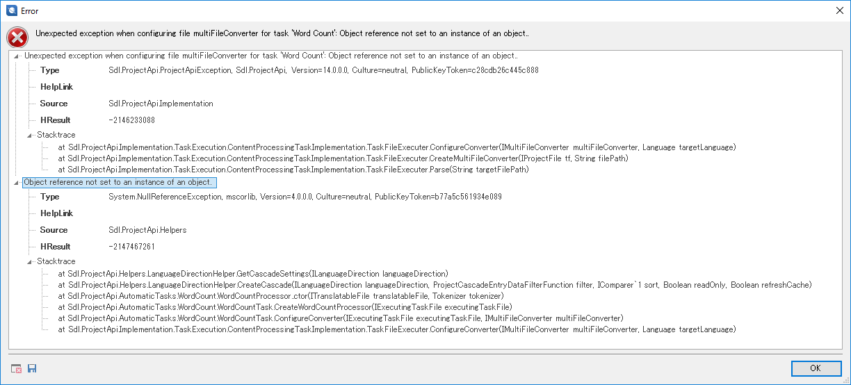 I'm using SDL Trados 2017 Project Automation API.  The code is working fine in creating project using template, adding files, scanning files, and converting to translatable format.  But when it got to Word Count, the exception occurred.  When I opened the project using SDL Trados Studio 2017, and looked at Task History of the project, I can see this error: