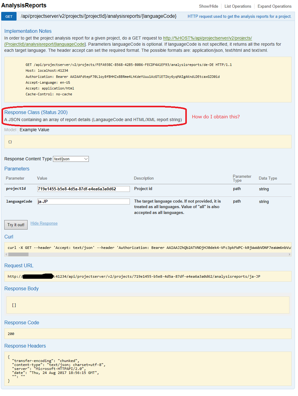 I have successfully accessed GroupShare Rest API (example: http://[myserver]:41234/documentation/api/index#/), used Login to receive token, used ProjectsV2 to get projects on our server, and then tried using AnalysisReports with one of the ProjectID. I receive response code 200, but response body only comes back []. How can I get a json containing an array of report details?