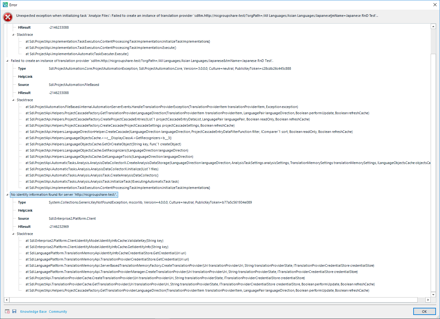 Sdl.ProjectAutomation.Core.ProjectAutomationException: Unexpected exception when initializing task 'Analyze Files': Translation Provider 'sdltm.example.localnet/.../TradosSample' Couldn't create instance. ---> Sdl.ProjectApi.ProjectApiException: Unexpected exception when initializing task 'Analyze Files': Translation Provider 'sdltm.example.localnet/.../TradosSample' Couldn't create instance. ---> Sdl.ProjectAutomation.Core.ProjectAutomationException: Translation Provider 'sdltm.example.localnet/.../TradosSample' Couldn't create instance ---> System.Collections.Generic.KeyNotFoundException: No identity information found for server 'http://example.localnet/'.