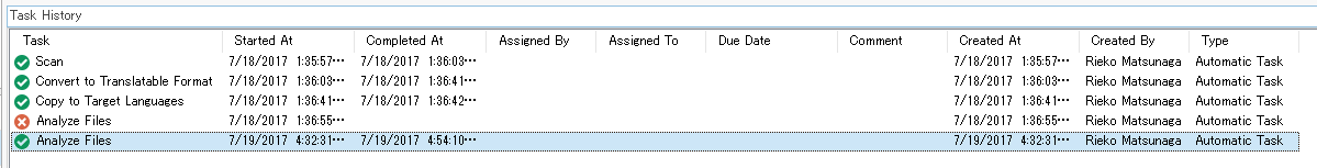 • Using Trados Studio, I opened the project that was created with API, and then run Batch->Analyze Files, it works fine.  Here's the Task History:
