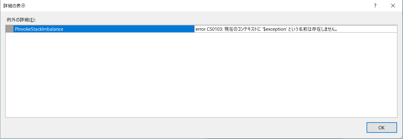 ビルド先になってますが、管理者モードでないと、そのフォルダには書き込みできないため、Visual studio の実行は管理者モードで起動しています。やっと、ここで起動することができましたが、実行すると、以下のエラーが発生します。