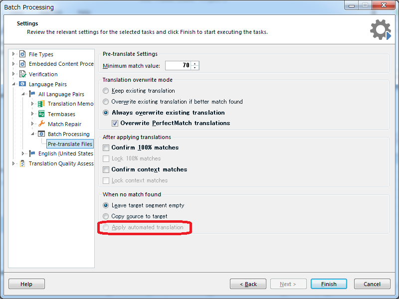 Trados Studio settings window with 'Apply automated translation' option in Pre-translate Files settings highlighted and inactivated.