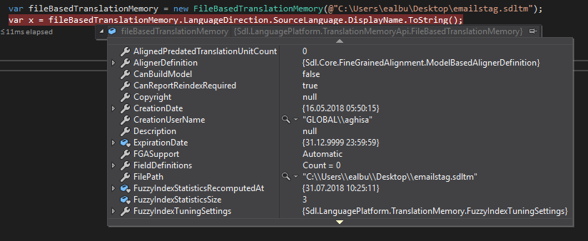 The fileTm object is actually opening as a FileBasedTranslationMemory. But most of its properties are showing an error. This was working fine yesterday and I don't know what has changed to make it not work.