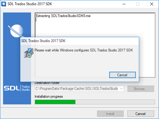 Screenshot of SDL Trados Studio 2017 SDK installation window with a progress bar, showing the message 'Please wait while Windows configures SDL Trados Studio 2017 SDK'. A 'Cancel' button is visible.