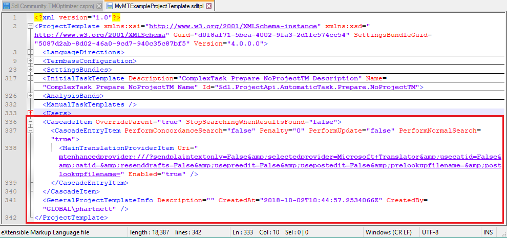 Screenshot of Trados Studio XML code with highlighted sections indicating the mt cascade entries in the template.