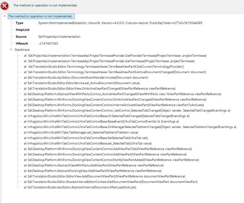 - Close Trados, re-open it. Then open project settings, or open the editor and you get the following error:
