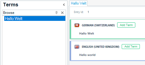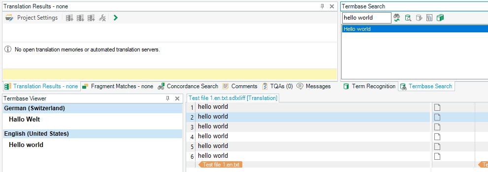If I now remove that MultiTerm termbase from the project and hook up my own termbase in its place (via the custom terminology provider), I can show that 'Hello world'/'Hallo Welt' is in this termbase because I can search for it and receive the result...