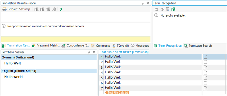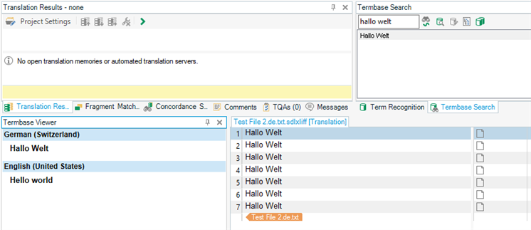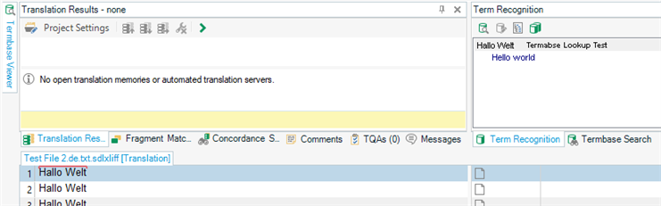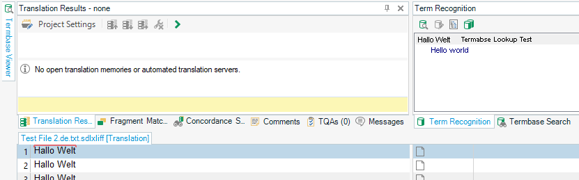 For example, in my test project I have a source document containing only the text 'Hallo Welt'. Attached to this project is a file-based MultiTerm termbase with only the following entry: