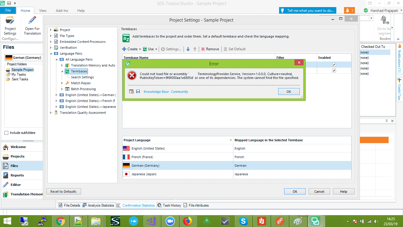 Error message in Trados Studio project settings showing 'TerminologyProvider.Service.dll file not found exception'.Solution Explorer in Visual Studio with TerminologyProvider project expanded showing references to TerminologyProvider.Service and TerminologyProvider.UI.