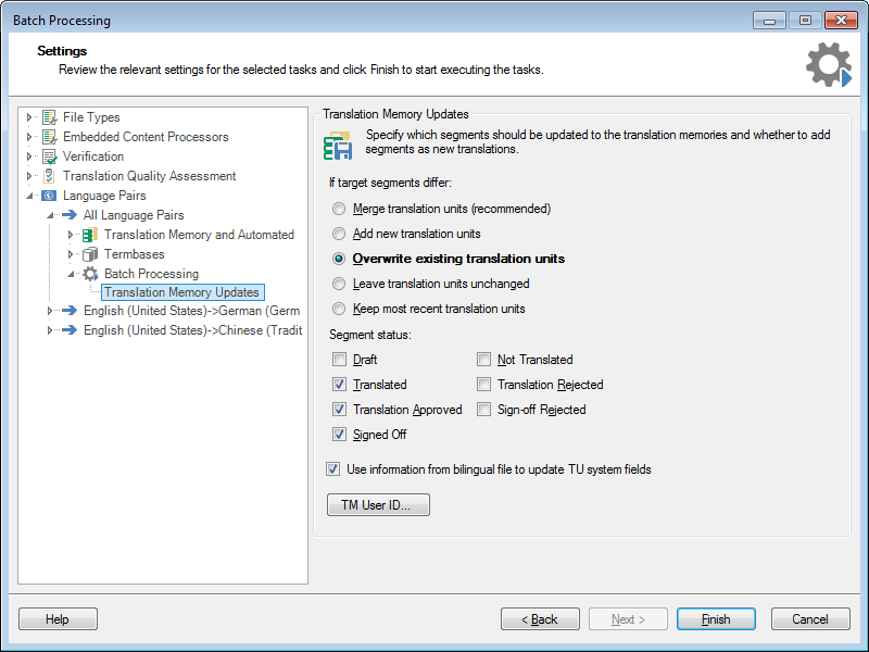 How do I change the settings for translation memory updates through the API? See the attachment for the dialogue I'm referring to. In Trados, you get there by selecting the project, right click, Batch Tasks > Update Main Translation Memories > click next until you come to Settings.