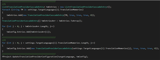 tmConfig.Entries.Add(new TranslationProviderCascadeEntry(settings.TargetLanguages[i].TranslationMemories[j], true, true, true, 0));