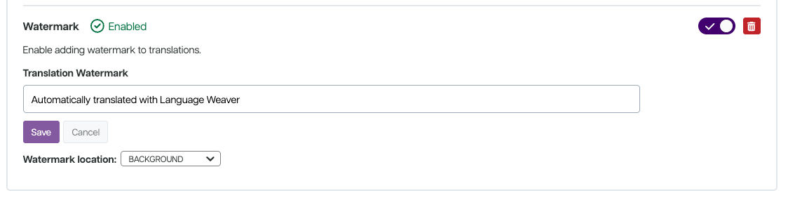 The watermark itself can be customised (set, by default, to “Automatically translated with Language Weaver”