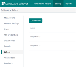 As a Language Weaver account administrator, go to 'Settings' > 'Labels' > 'Create Label':