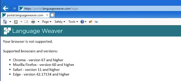 If users are still accessing the Language Weaver portal using Internet Explorer, the following message will be displayed: