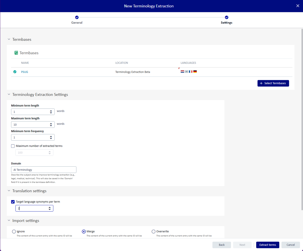 Figure 1: AI Terminology Extraction Settings
