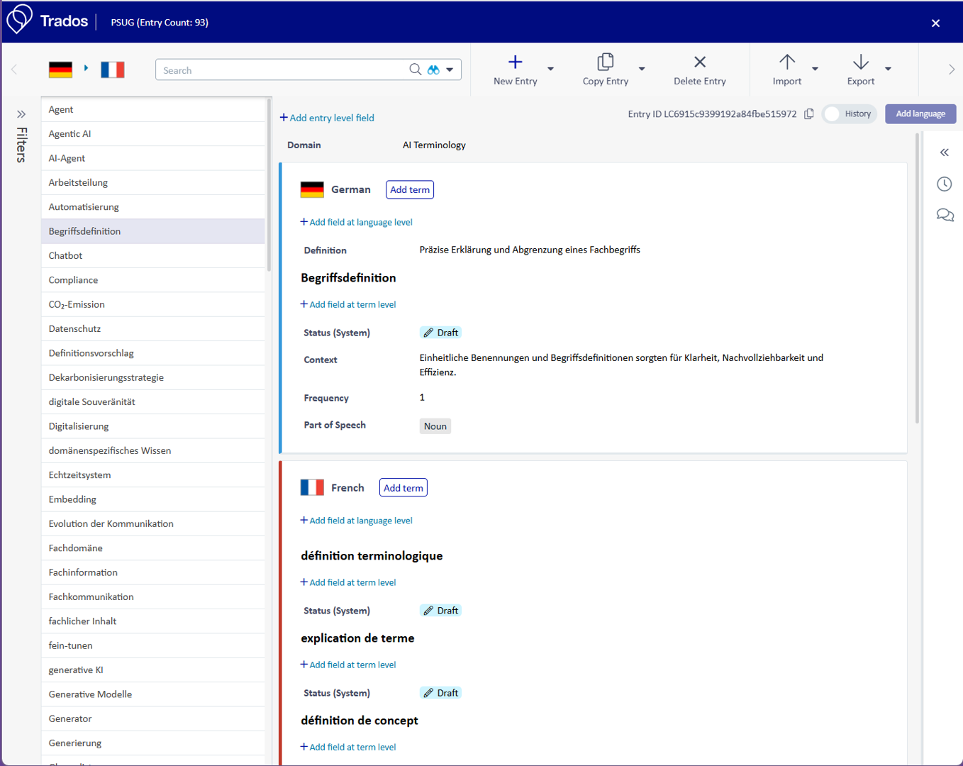 - Automatic LLM-driven population of termbase fields enables you to generate context-rich terminology entries. The target termbase includes fields like: