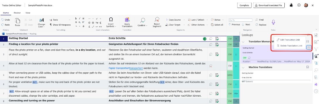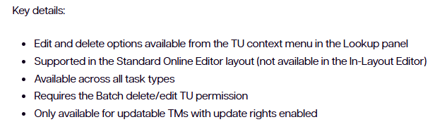 Users can now edit or delete translation units (TUs) directly from the Lookup panel in the Online Editor, enabling faster and more efficient TM maintenance without leaving the Online Editor.