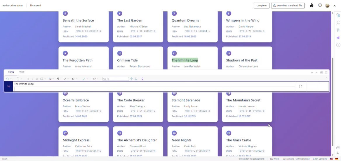 The In-Layout Editor has been extended to support HTML and XML file formats, allowing users to review and edit these files directly in a full-page, layout-based preview. This delivers a more intuitive, accurate, and in-context editing experience - particularly valuable for Subject Matter Experts.