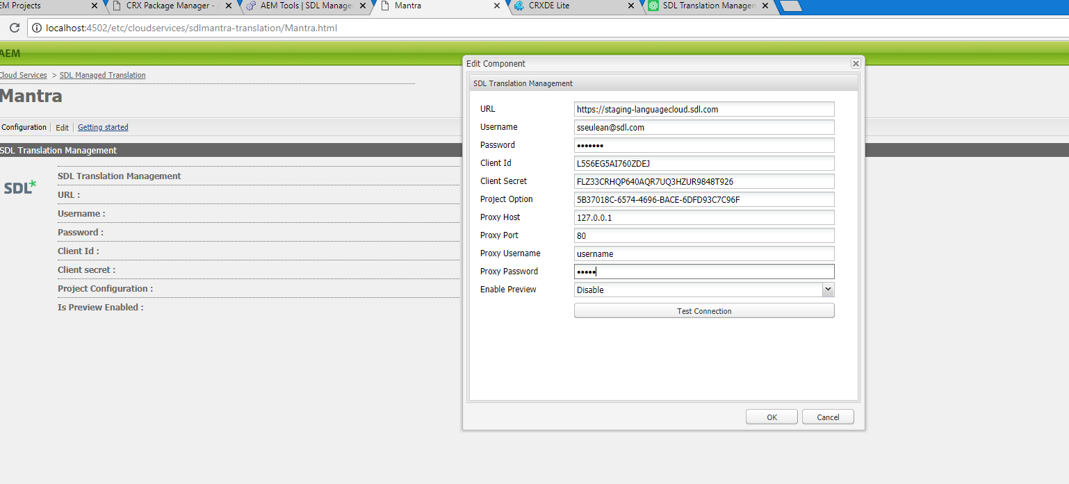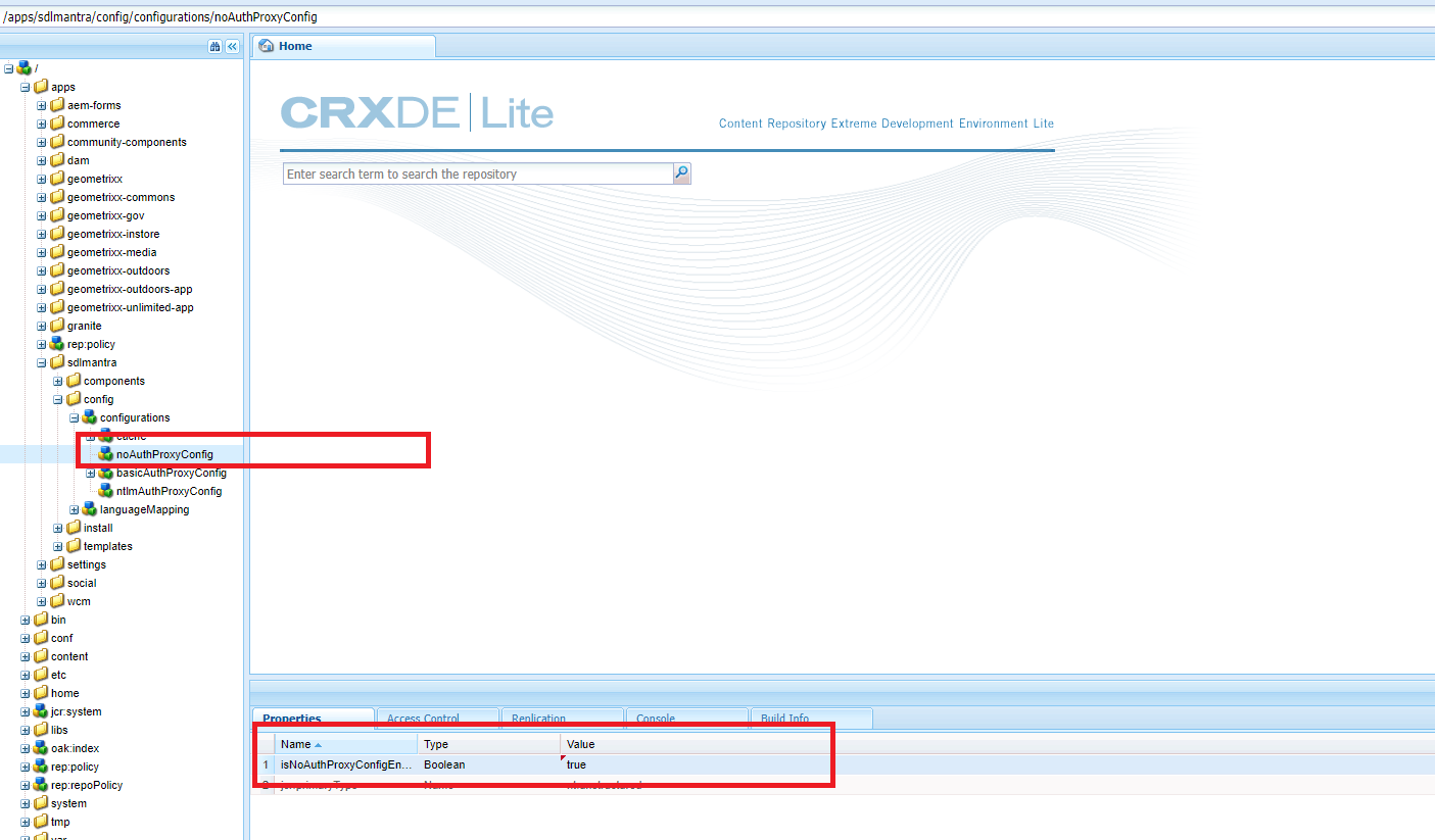 - Access localhost:4502/.../de and in sdlmantra/sdlws directory select noAuthProxyConfig and set it's value to true: