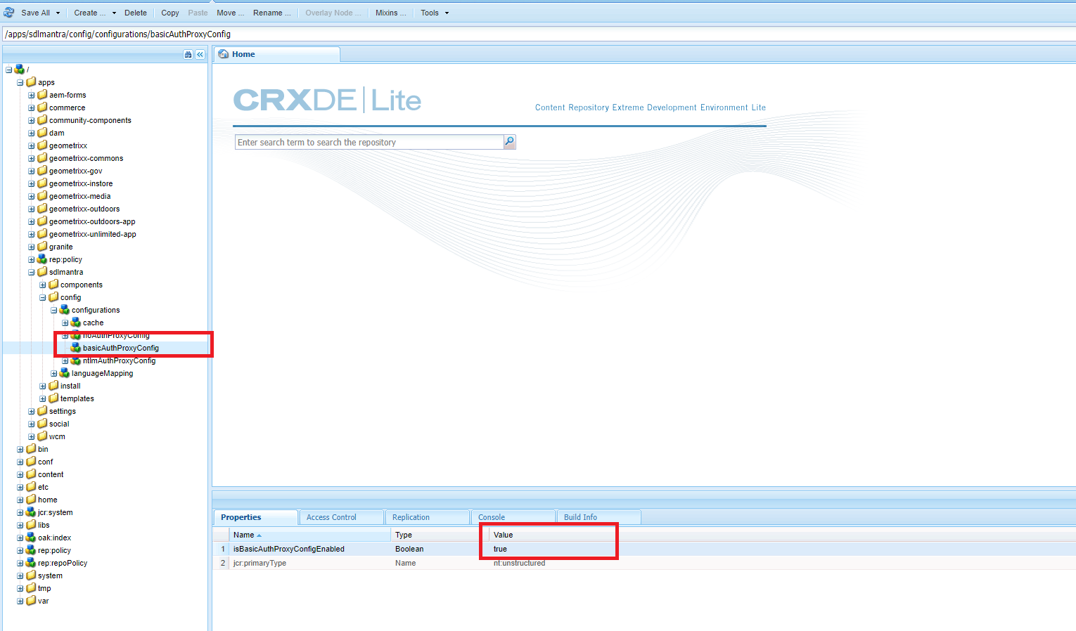 - Access localhost:4502/.../de and in sdlmantra/sdlws directory select basicAuthProxyConfig and set it's value to true: