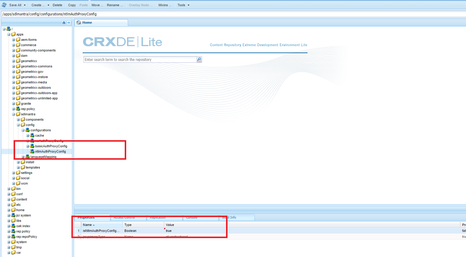 - Access localhost:4502/.../de and in sdlmantra/sdlws directory select ntlmAuthProxyConfig and set it's value to true: