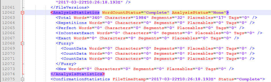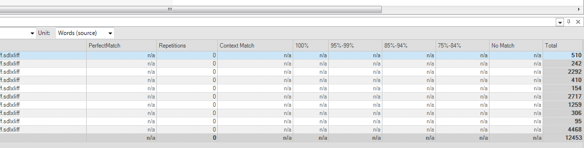 The wordcount in the Files view in Studio turns to ”n/a” for all categories except Repetitions and Total, see screenshot. This happens when checking in files, and even when cancelling a checkout. The analysis function works as it should. It displays correctly in the Reports view and the XML files still contain the correct analysis, but it seems like the link to display the numbers in Studio does not work. And it's only for GroupShare projects, not for offline projects.