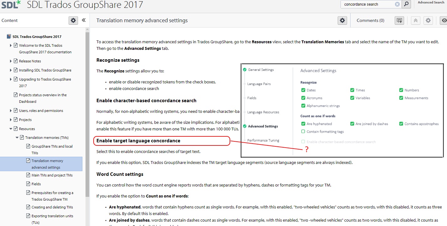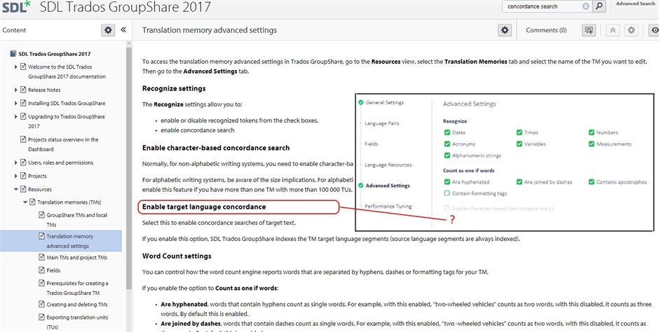 The image shows that there is no option that would enable "target language concordance". (I have inserted a screenshot from GroupShare onto the Online docs topic)