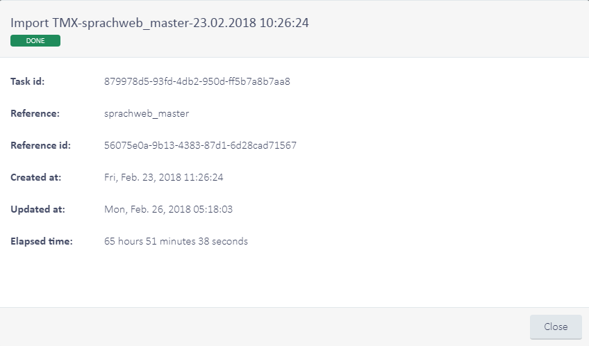 Another thing we realized, which seems to be a bug: even after the background process of the import has completed on the server, the "Elapsed time" count continues to count up. Currently it shows this: