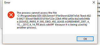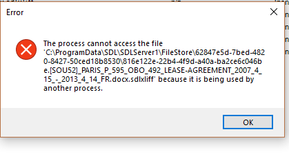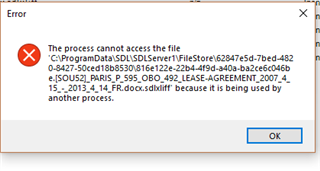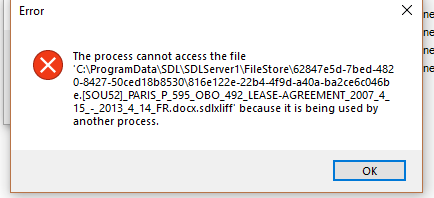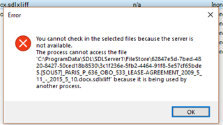 "The process cannot access the file as it is being used by another process" and related errors" (see screen shots). Sometimes it various slightly (see screen shots). This happens when I try to check in a file on a server-based project. This happens if I try to check in a single file or multiple files. It seems to allow me to change the phase to FINALISATION (see screen shot), but then gives the error.
