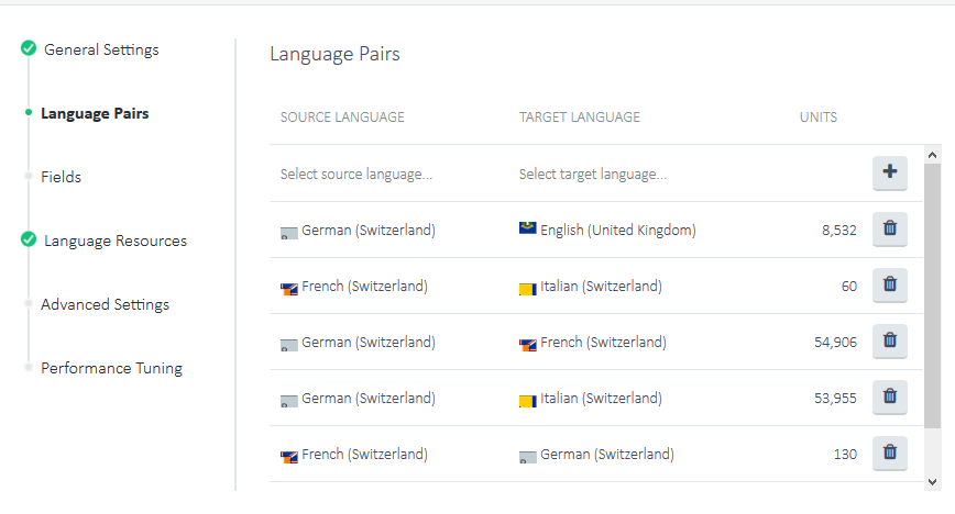 Trados Studio screenshot showing Language Pairs settings with unusual flags next to language combinations such as German (Switzerland) to English (United Kingdom).