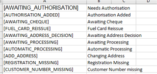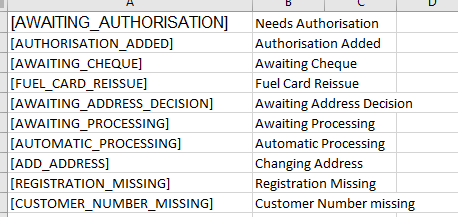 Example: [AWAITING_AUTHORISATION]:Needs Authorisation|[AUTHORISATION_ADDED]:Authorisation Added|[AWAITING_CHEQUE]:Awaiting Cheque|[FUEL_CARD_REISSUE]:Fuel Card Reissue|[AWAITING_ADDRESS_DECISION]:Awaiting Address Decision|[AWAITING_PROCESSING]:Awaiting Processing|[AUTOMATIC_PROCESSING]:Automatic Processing|[ADD_ADDRESS]:Changing Address|[REGISTRATION_MISSING]:Registration Missing|[CUSTOMER_NUMBER_MISSING]:Customer Number missing|[VALIDATION_COMPLETE]:Validation Complete|[CARD_NUMBER_MISSING]:Card Number missing|[CANCEL_AWAITING]:Awaiting Card Cancellation|[CONTRACT_EXTENTION_AWAITING]:Awaiting Contract Extension|[AWAITING_CLAIM_HANDLING]:Awaiting Claims Handling|[AWAITING_CONTRACT_EXTENSION]:Awaiting Contract Extension|[DOCUMENT_GENERATION_REQUESTED]:Document GenerationRequested|[NOTIFICATION_SENT]:Notification Sent|[PENDING_ANSWER]:Pending Answer|[ANSWER_REGISTER]:Answer Register|VA_NOT_SCHEDULED: VA Not Scheduled|[VA_SCHEDULED]:VA Scheduled|[REGISTERED_VA]:Registered VA|[DECIDED_TO_EXTEND]:Decided to extend|[DECIDED_TO_BUY]:Decided to buy|[DECIDED_TO_RETURN]:Decided to return|[CLAIM_INFORMATION_MISSING]:Claims Information Missing|[AWAITING_INSURANCE_RESPONSE]:Awaiting Insurance Reponse|[AWAITING_CHANGE_HANDLING]:Awaiting Change Handling|[ADDRESS_CHANGE_FINISHED]:Address Change Completed|[BANK_CHANGE_FINISHED]:Bank Account Change Completed|[AWAITING_ES_QUOTES]:Awaiting Response|[PROCESSING_FINISHED]:Processing Finished|[BANK_ACCOUNT_CHANGE_FINISHED]:Bank Account Assigned