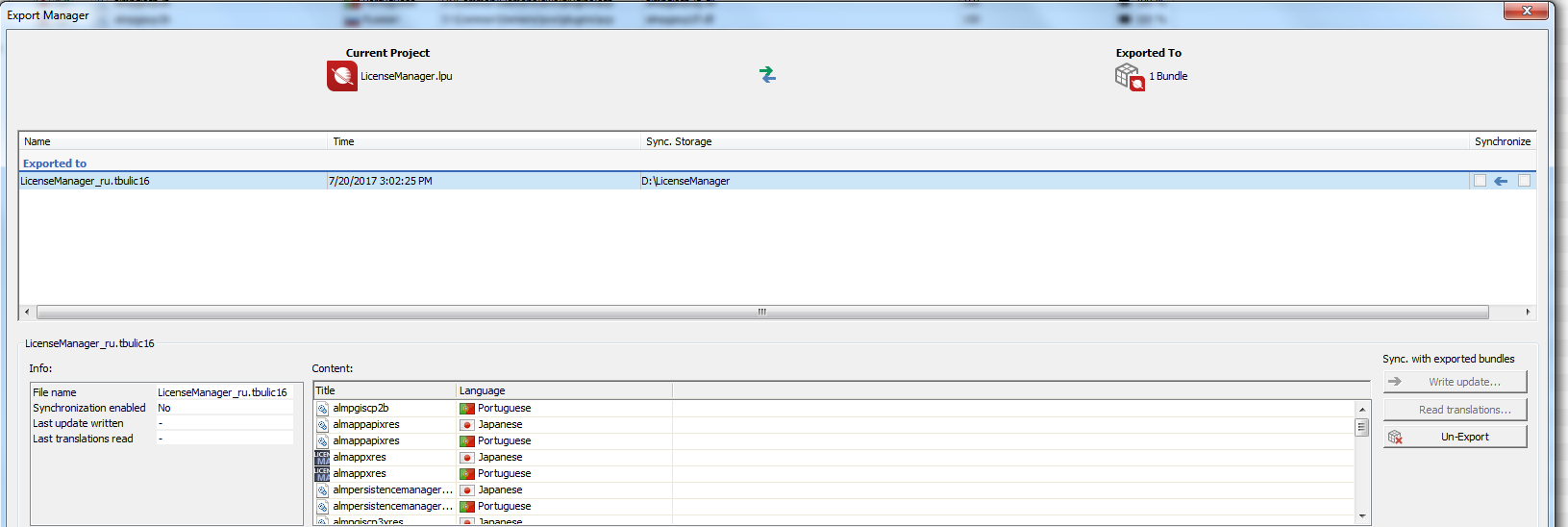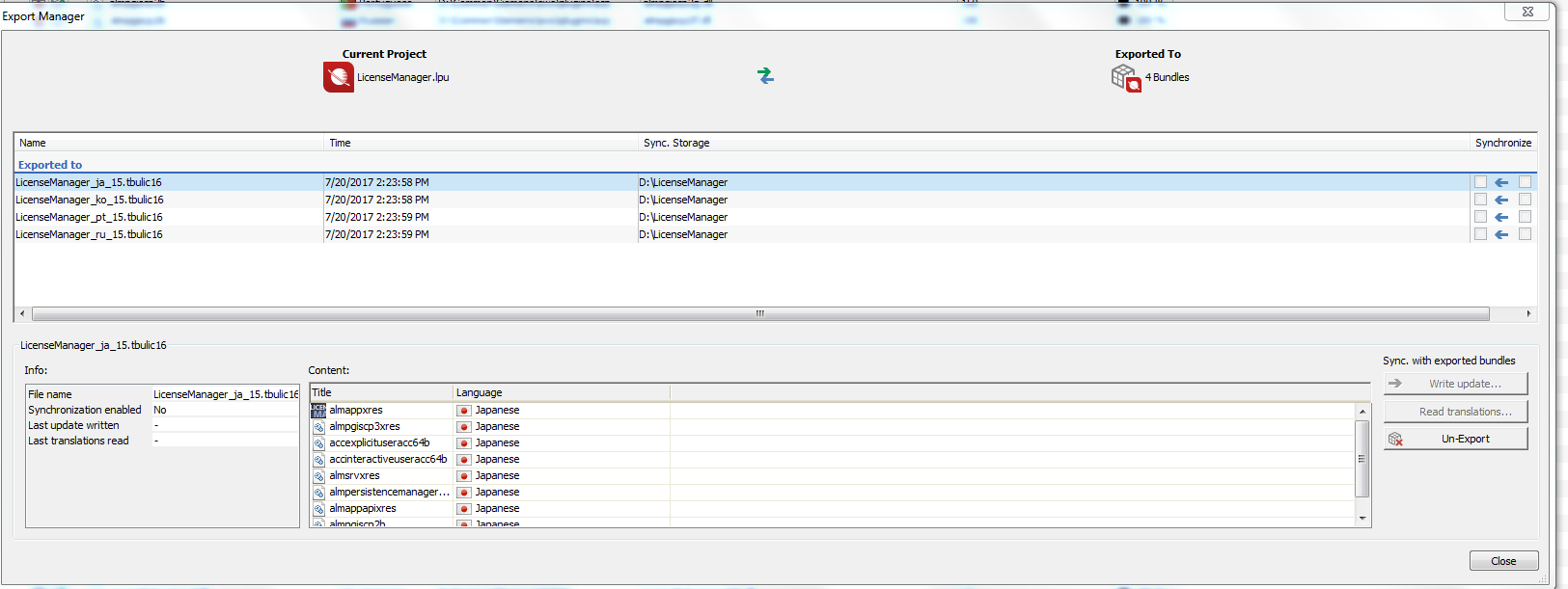 Tbulics are getting created but in export manager list it's not getting updated that it has been exported to 4 language specific tbulics, rather it's showing it got exported to 1 tbulic (i.e. the last tbulic to which it got translated). Because of this issue I am not able to import back those tbulics since it is not mapped.