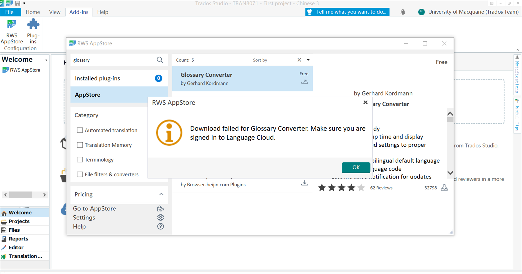 I have trouble installing apps from Trados studio, even though I’ve logged in