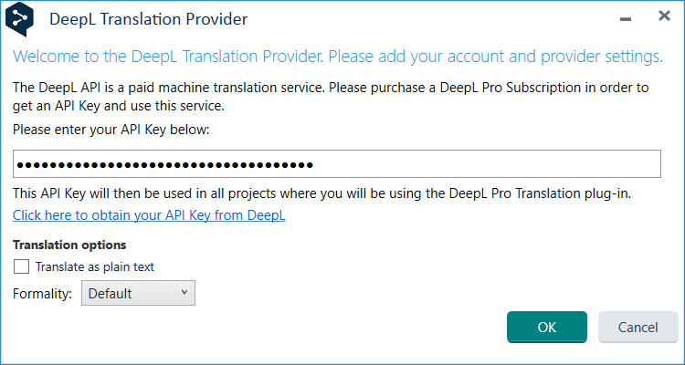 I've uninstalled the DeepL Translation Provider via the AppStore, restarted Studio and then installed it from the AppStore again, but still get the same result. In case it's relevant, I'm using Studio 2021 SR2, not Studio 2022.