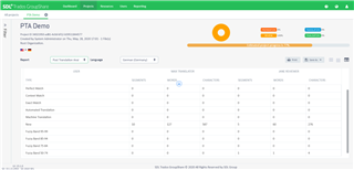 In detail, the PTA shows the number of words, segments and characters translated by each translator who has worked on a project file. The counts are grouped by match rate to help you determine translation efforts accurately: