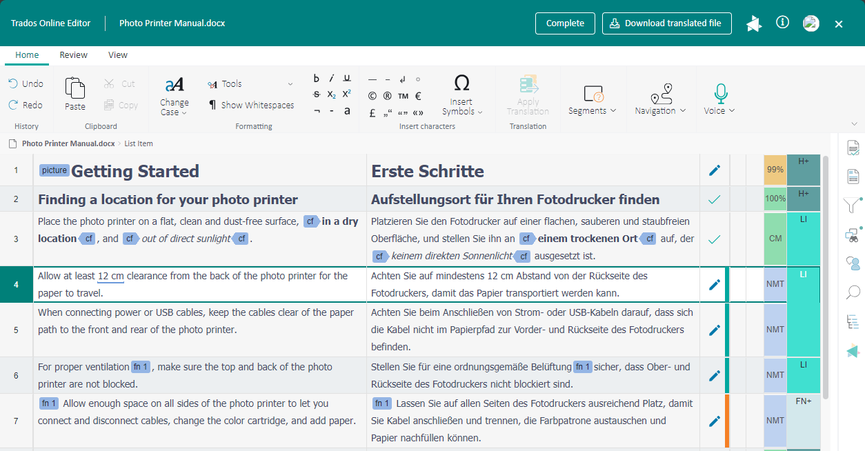 If you have a customer that sends you files using Language Weaver for machine translation with a language pair that supports Machine Translation Quality Estimation (MTQE), the quality estimation results are now visible in both the Online Editor and Trados Studio 2024. The results are color-coded to allow you to quickly identify which segments are good (green), which ones are adequate (amber), and which ones are poor (red). When you open the file for editing, you will see the color code as part of the segment status.