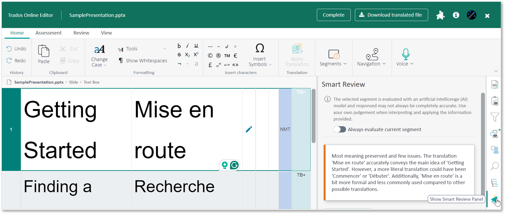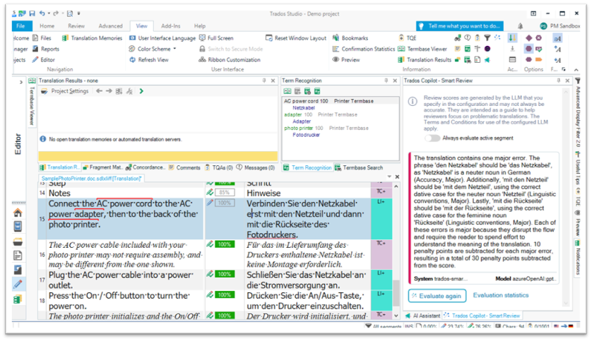 Trados Copilot - Smart Review uses AI to evaluate the quality of translations in your documents while you are working in Trados Studio or the Online Editor. This means you can focus on those segments that need attention based on the evaluation score it provides.
