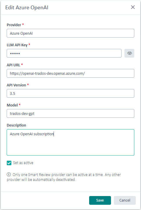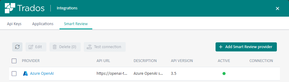 To perform the evaluation, Smart Review uses an Azure OpenAI LLM which is prompted with information on other approved segments and approved terminology. For those customers that already have the Smart Review feature enabled, you can now configure your implementation yourself from within your tenant by providing the details of your subscription. For those customers who don’t currently have this enabled, please contact us to discuss how you can purchase subscription packages such as AI Essentials that will give you access to this feature and other AI-enabled features. To configure Smart Review, go to the Integrations menu in your account and you’ll see a new tab: