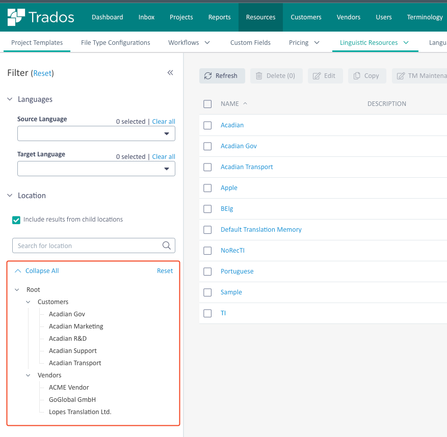 Also, we have introduced Location trees, available in other screens in the UI, in Translation Memory, File Type Configuration and Language Processing rules filter views. This provides a cleaner and more hierarchical view on resources: